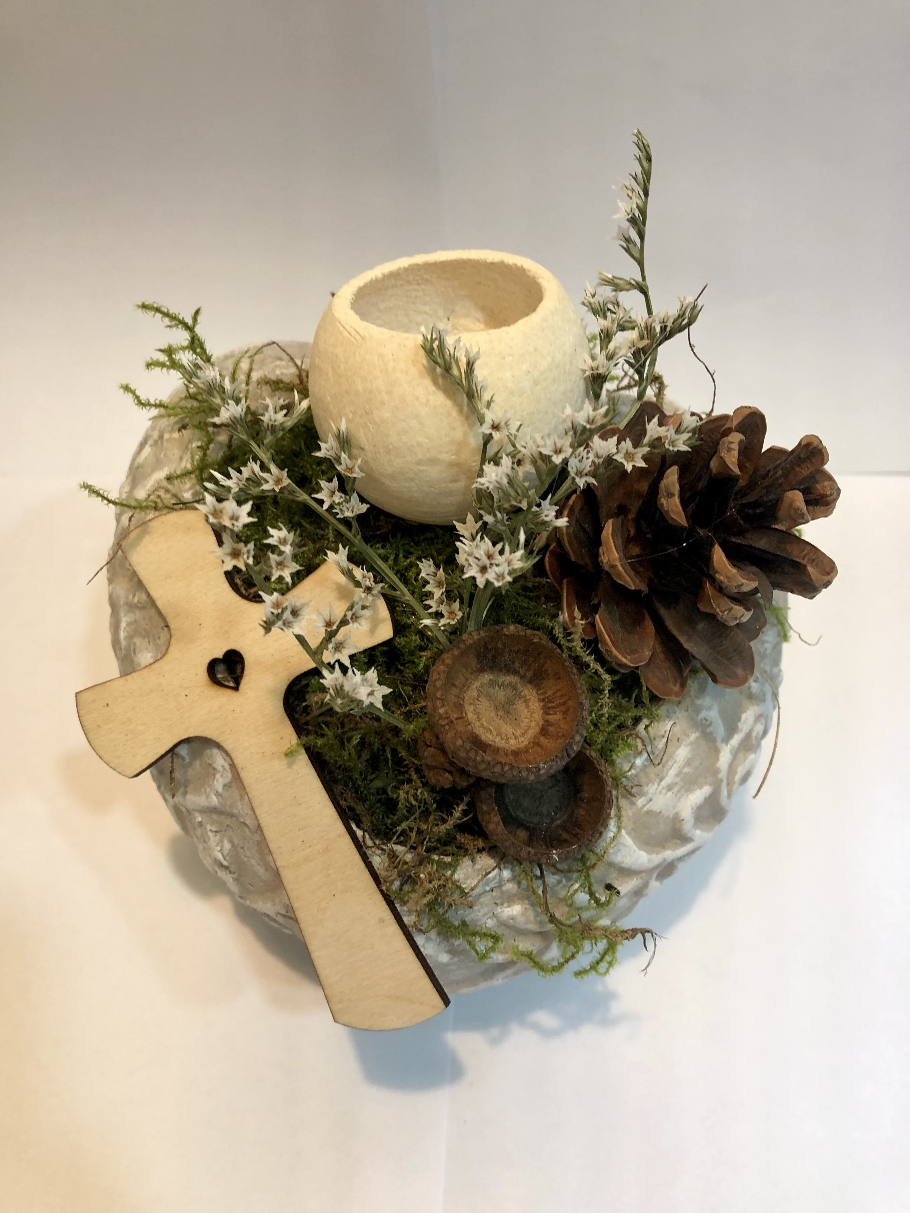 Polyresin, mech, přírodní šiška, statice tatarika, sušina, dřevěný kříž